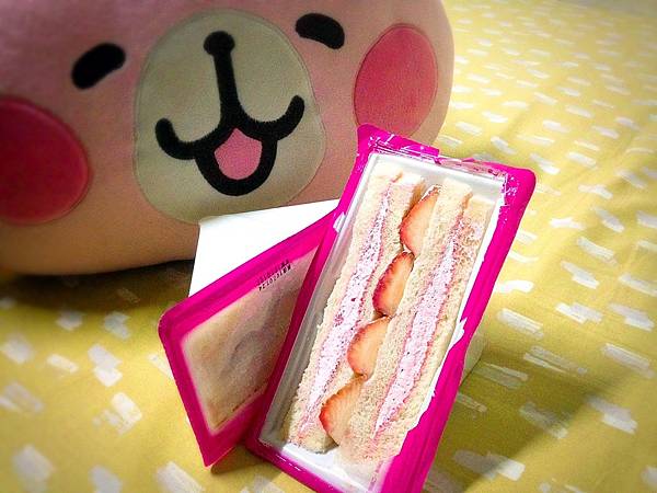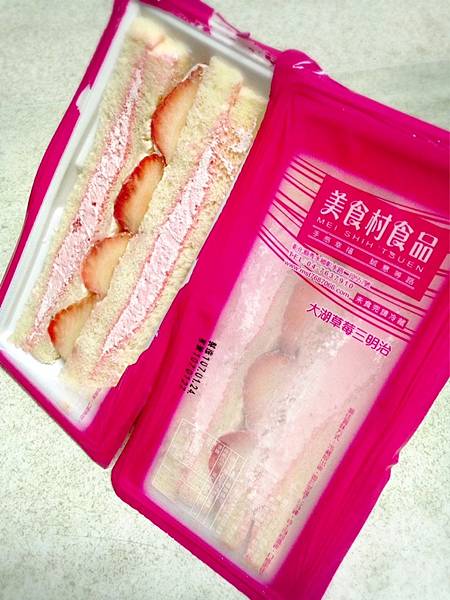 口感部分三明治內夾著草莓奶油跟些許的草莓醬還有真正的草莓光打開就有濃濃的草莓香撲鼻而來,